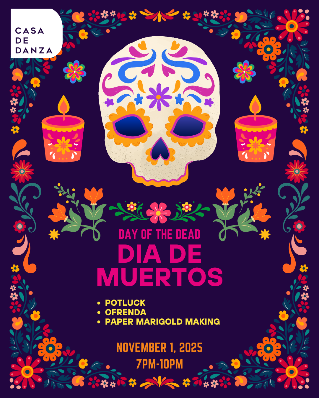 Come anytime between 7PM-10PM to honour your loved ones at the Ofrenda, enjoy the potluck, create paper marigolds, and celebrate Dia de Muertos in community.